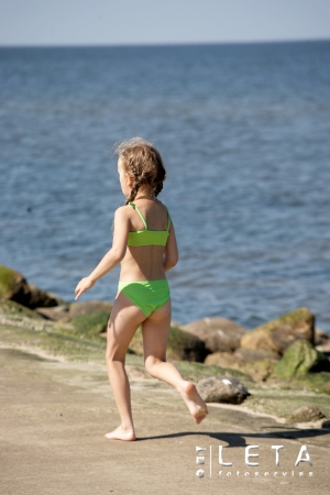 Meitenīte karstā vasaras dienā pie Daugavas Mangaļsalā.