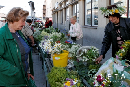 Jāņu zāļu un vainagu tirdzniecība Rīgas Centrāltirgū.