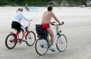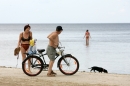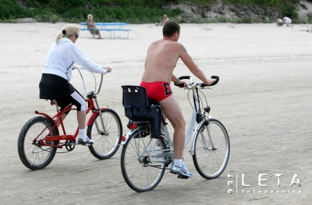 Velosipēdisti vasaras dienā jūrmalā pie Dubultiem.