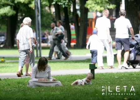 Sieviete ar bērnu Vērmaņdārza zālienā.