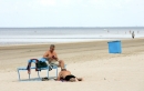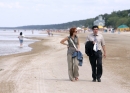 Atpūtnieki ar suni vasaras dienā jūrmalā Dubultos.