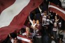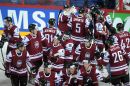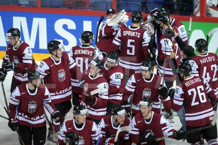 Сборная Латвии по хоккею празднует победу в матче ЧМ со Словакией 9 ...