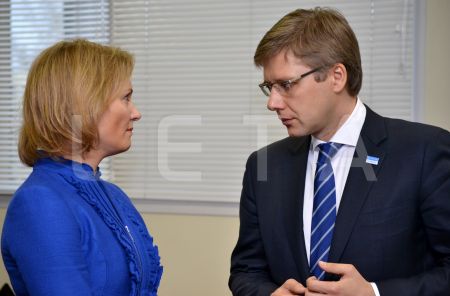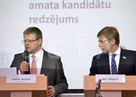 Нил Ушаков (справа) и Гунтис Белевич на дискуссии кандидатов в мэры ...