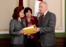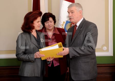 Руководитель ЛФП Андрис Силиньш передает спикеру Сейма Солвита ...
