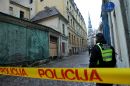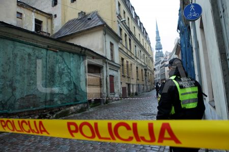 Полицейское ограждение на ул. Пейтавас, где частично обрушилась стена ...