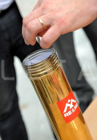 Kapsulā ar vēstījumu nākamajām paaudzēm tiek ievietota monēta, lai ...