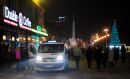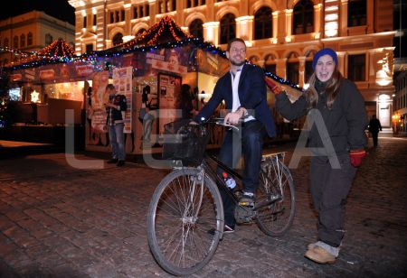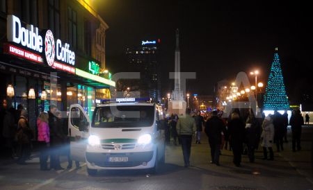 Cilvēki un pašvaldības policijas automašīna Kaļķu ielā pēc Jaunā gada ...