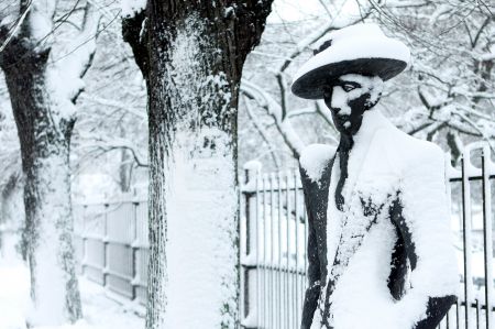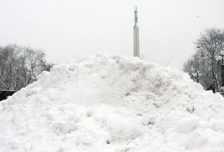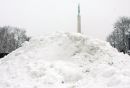 Sniega kaudze kanālmalas apstādījumos pie Brīvības pieminekļa.