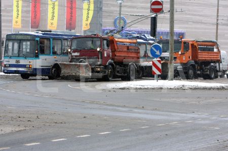 Sniega tīrītāji un trolejbuss Marijas ielā.