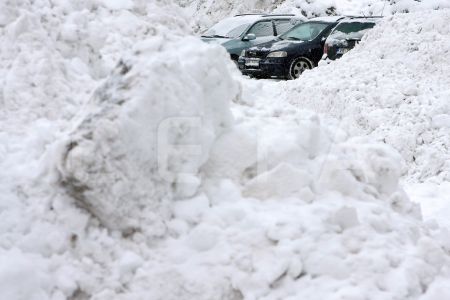 Automašīnas un sniega kaudzes.