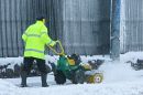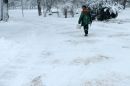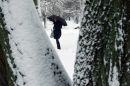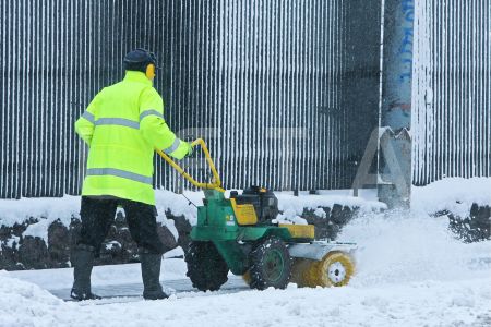 Sētnieks tīra sniegu kanālmalas apstādījumos.