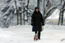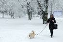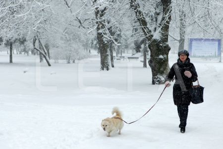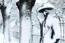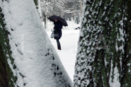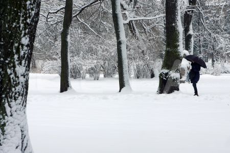 Apsniguši koki un sieviete ar lietussargu Viesturdārzā.