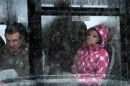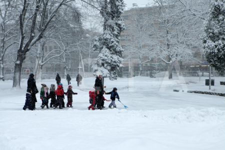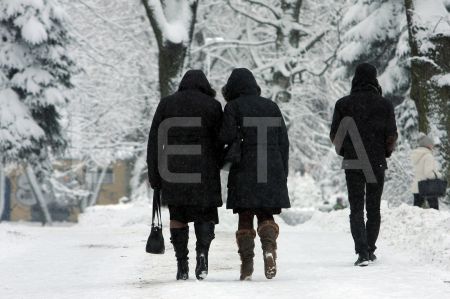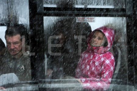Cilvēki sabiedriskajā transportā sniegputeņa laikā.