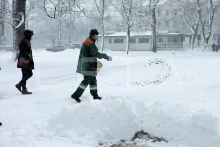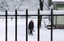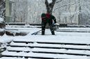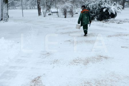 Sētnieks kaisa smiltis piesnigušajā Vērmanes dārzā.