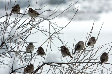 Zvirbuļi košumkrūma zaros.