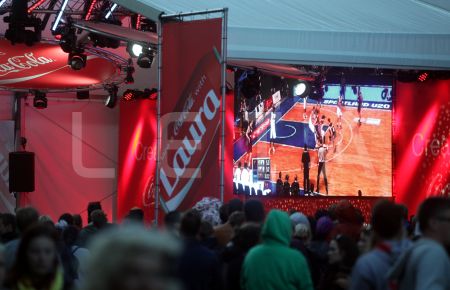 Cilvēki vēro Eiropas čempionāta finālspēli basketbolā lielākajā ...