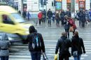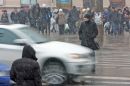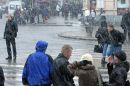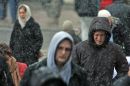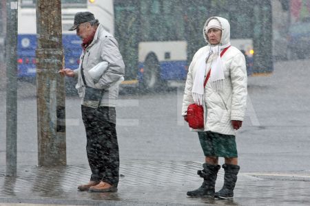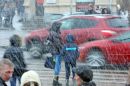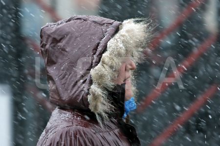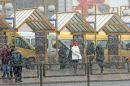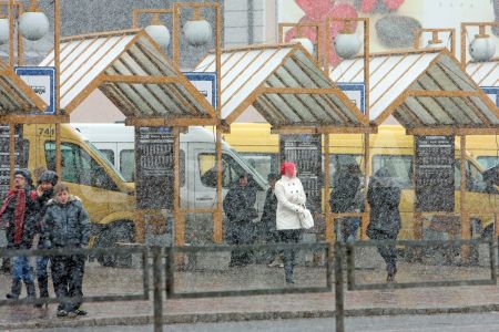 Cilvēki sniegputeņa laikā mikroautobusu galapunktā Stacijas laukumā.