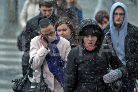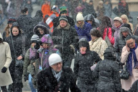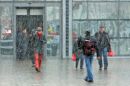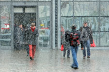 Cilvēki sniegputeņa laikā Rīgas centrālās dzelzceļa stacijas laukumā.