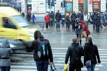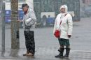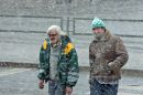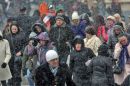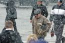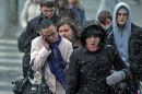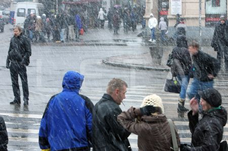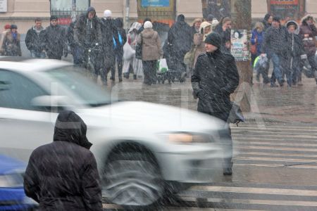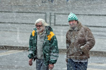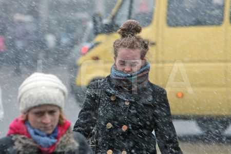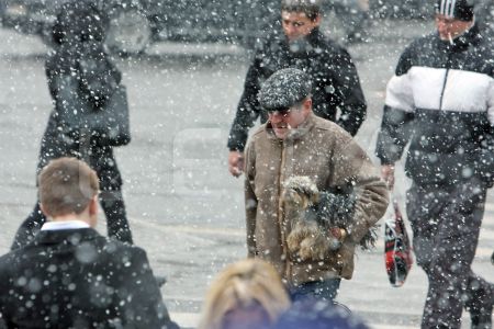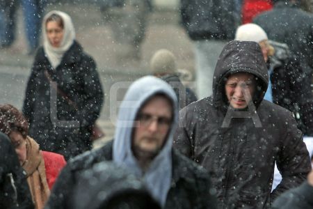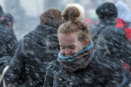Cilvēki sniegputeņa laikā Marijas ielā.