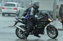 Vīrietis ar motociklu sniegputeņa laikā.