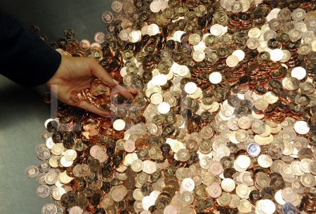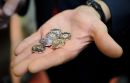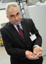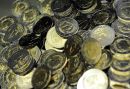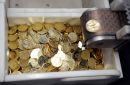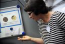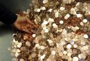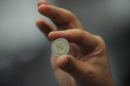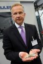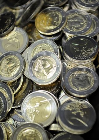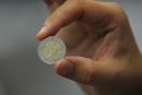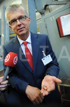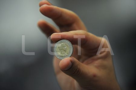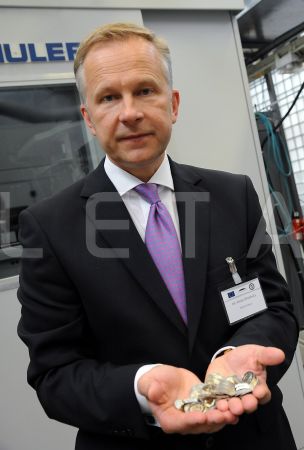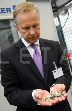 Kaltuves direktors Peters Hūbers ar jaunajām Latvijas eiro monētām ...