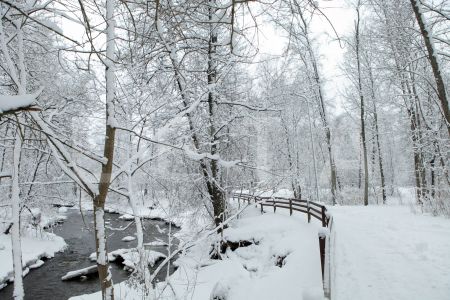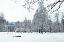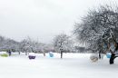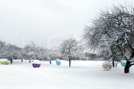 Apsnigušas Lieldienu dekorācijas ābeļdārzā Ķekavā.