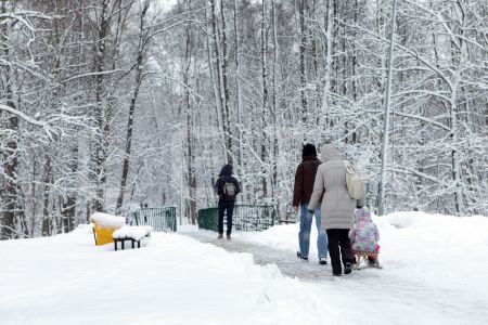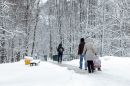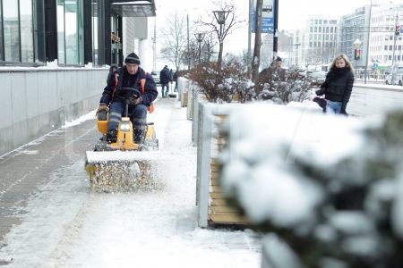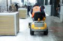 Tiek tīrīts sniegs no gājēju ietves pie tirdzniecības centra ...