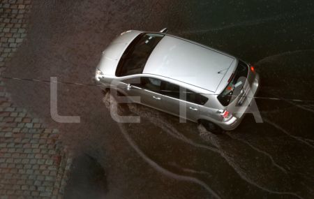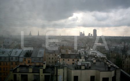 Skats no viesnīcas "Albert Hotel" uz namu jumtiem pirms negaisa.