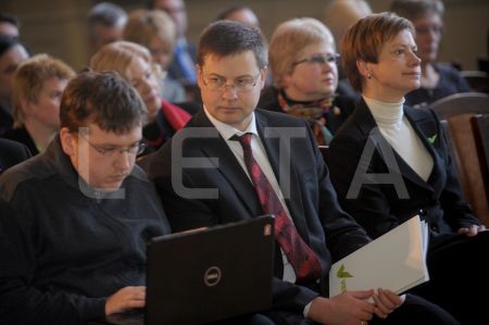 Ministru prezidents Valdis Dombrovskis (centrā) un partijas ...