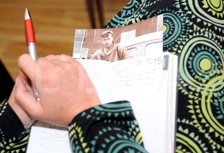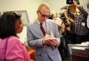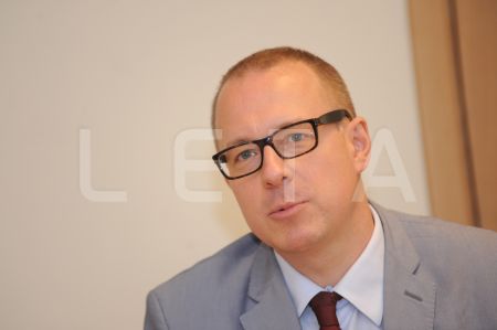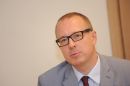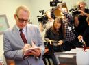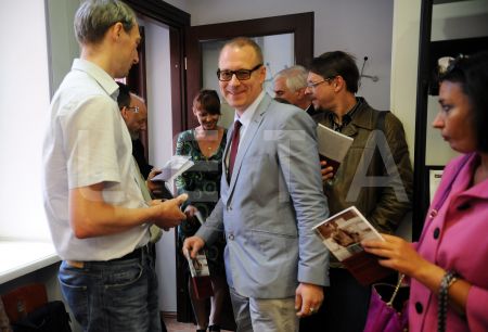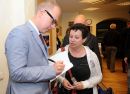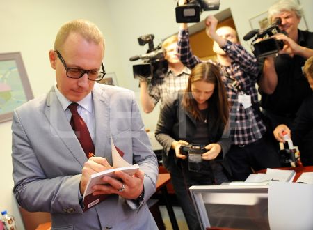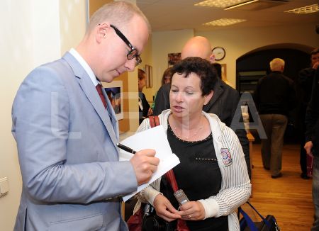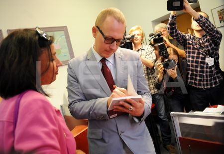 Saeimas deputāts Nikolajs Kabanovs (centrā) sniedz autogrāfu preses ...