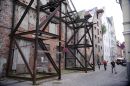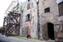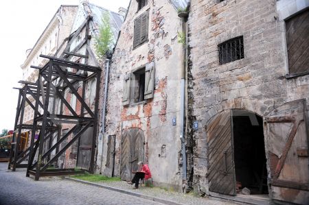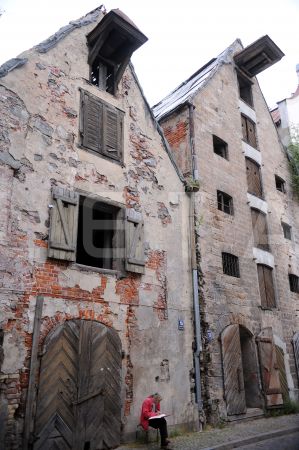 Mākslinieks pie vēsturiskās noliktavu ēkas Vecrīgā, Miesnieku ielā.