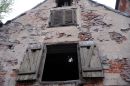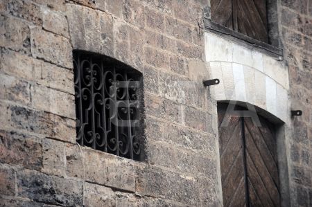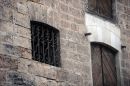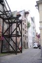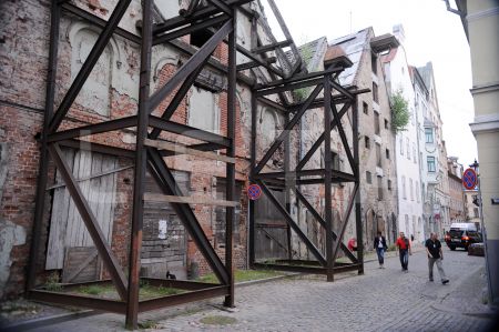 Kaķis pie vēsturiskās noliktavu ēkas Vecrīgā, Miesnieku ielā.