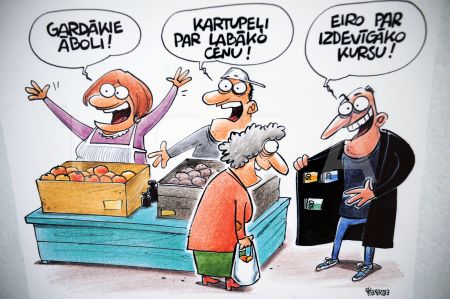 Mākslinieka Gata Šļūkas karikatūra "Mainiet naudu bankā vai pastā" ...
