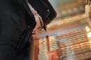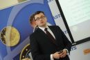Vīrietis aplskata monētas preses konferences "Naudas maiņas tīkls un ...