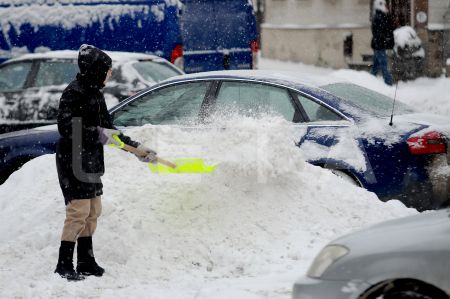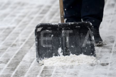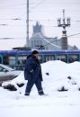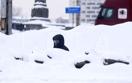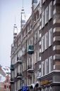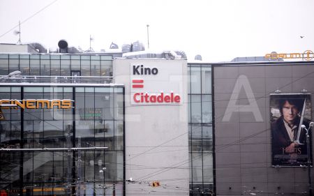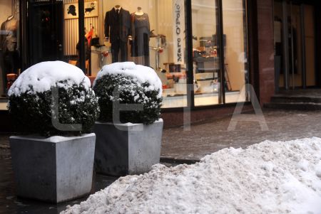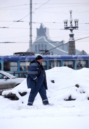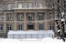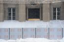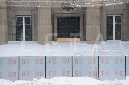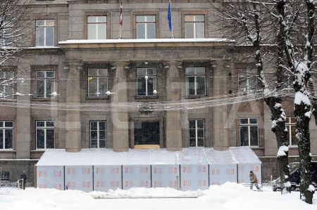 Norobežojums Ministru kabineta ēkas fasādes kāpņu remonta laikā.