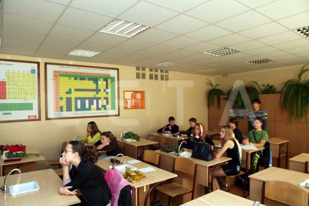 Skolēni Rīgas 46. vidusskolas ķīmijas kabinetā, kurš iekārtots par ...