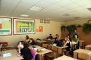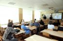 Rīgas 46. vidusskolas skolotājas sēž solos ķīmijas kabinetā, kurš ...