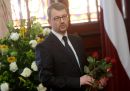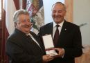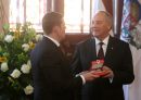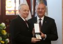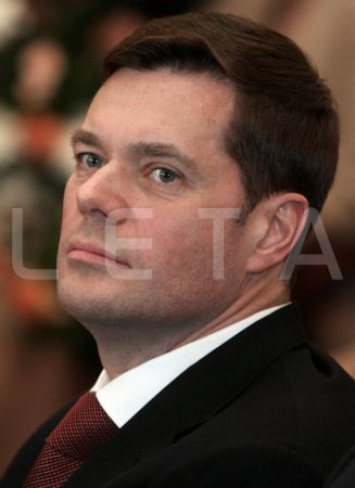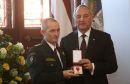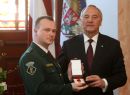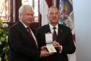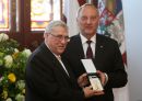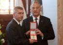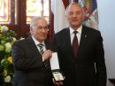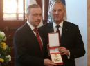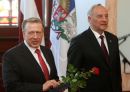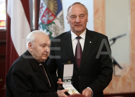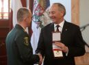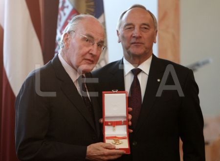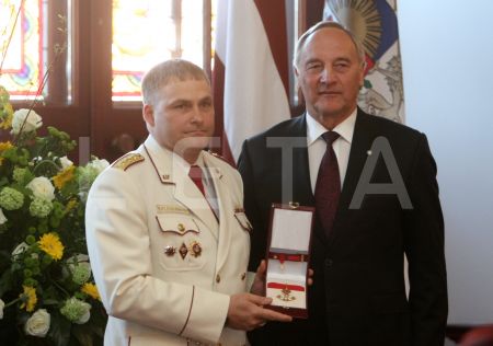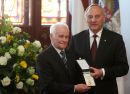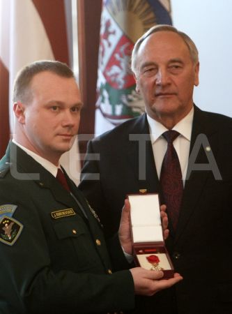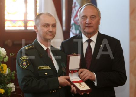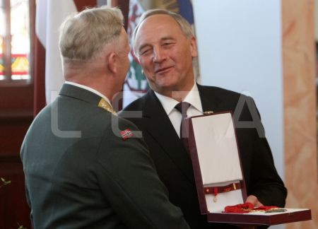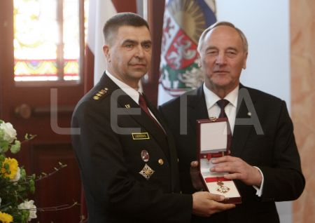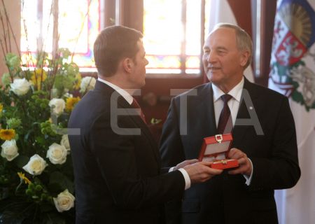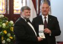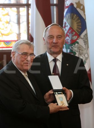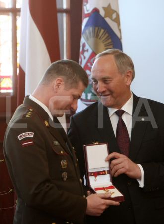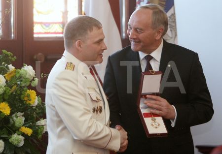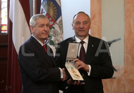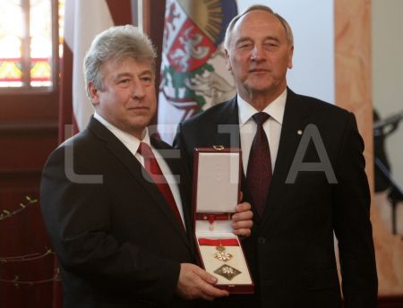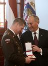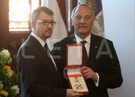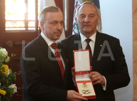 Valsts prezidents Andris Bērziņš (no labās) pasniedz valsts ...