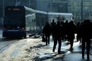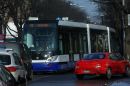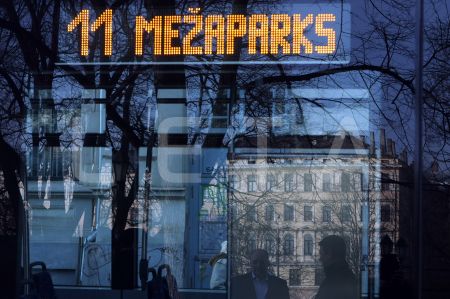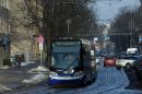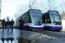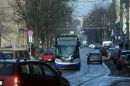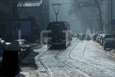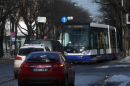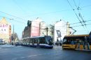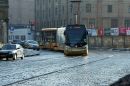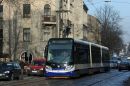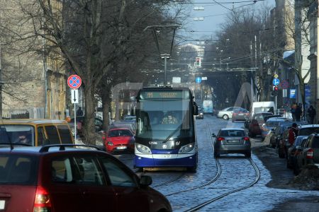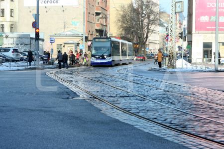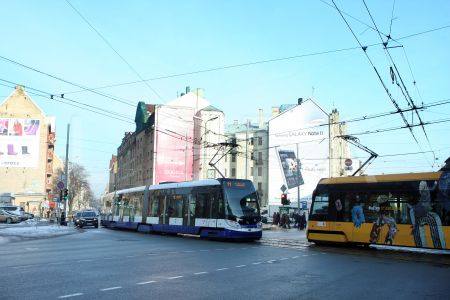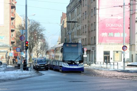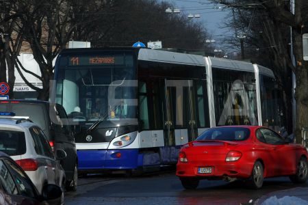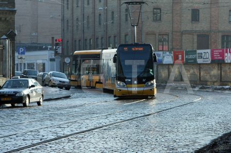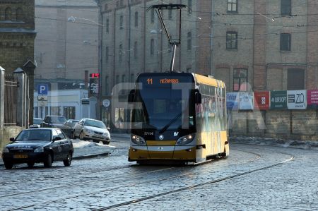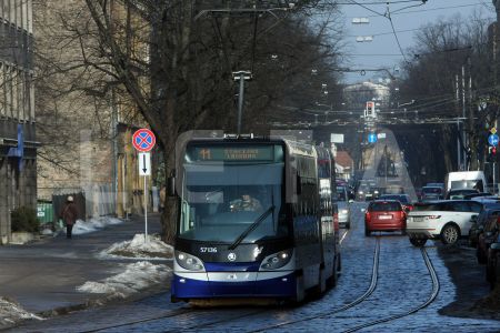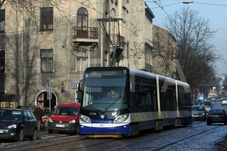 Pagarinātais, četru sekciju zemās grīdas 11.maršruta tramvajs šķērso ...