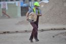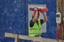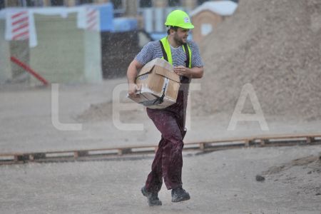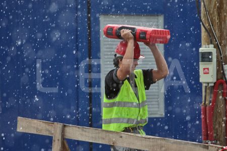 Strādnieks lietū Valsts ieņēmumu dienesta jaunā administratīvo ēku ...