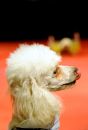 Dresētāja ar pūdeli uzstājas preses konferences laikā, kurā ...
