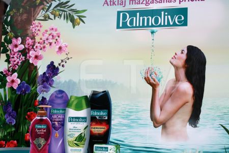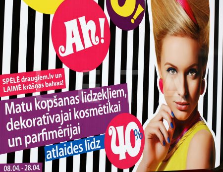 Šampūnu reklāma veikala "Drogas" skatlogā.