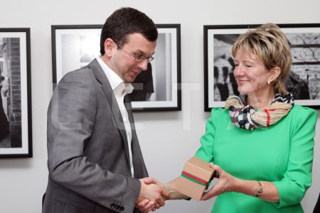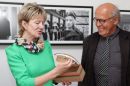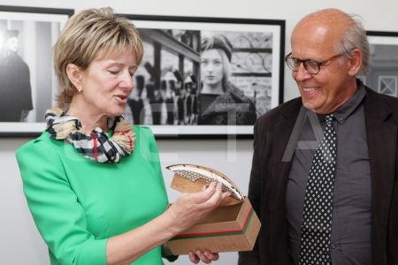 Liepājas domes priekšsēdētāja vietniece Silva Golde pasniedz piemiņas ...