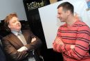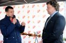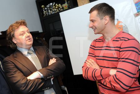 Skeletonists Martins Dukurs (no kreisās) un pasākuma vadītājs Valters ...