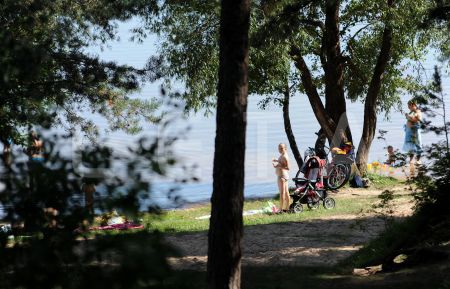 Cilvēki peldvietā pie Ķīšezera kultūras un atpūtas parkā "Mežaparks".