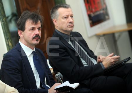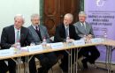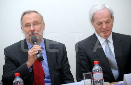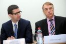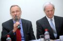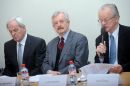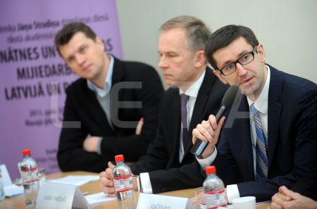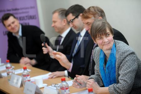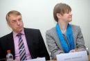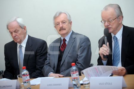 Preses konferences vadītājs, žurnālists Arnis Krauze (no kreisās), ...