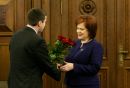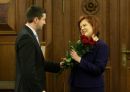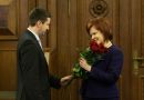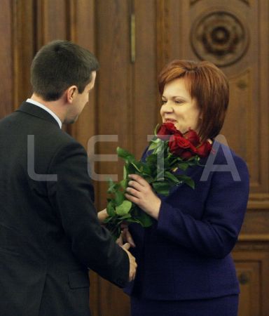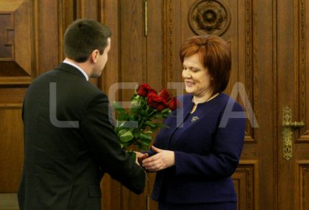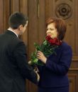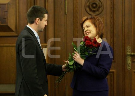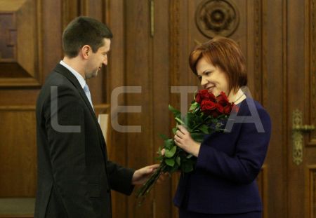Saeimas deputāts Vjačeslavs Dombrovskis pasniedz ziedus ...