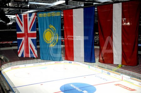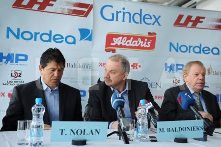 Latvijas hokeja izlases galvenais treneris Teds Nolans (no kreisās) ...