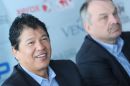 Latvijas hokeja izlases galvenais treneris Teds Nolans (no kreisās), ...