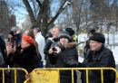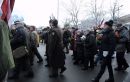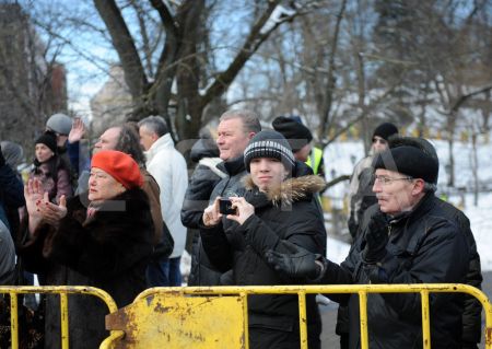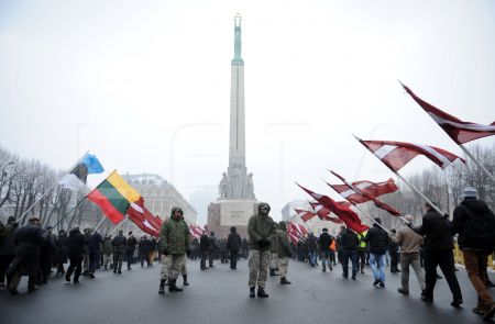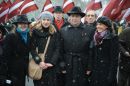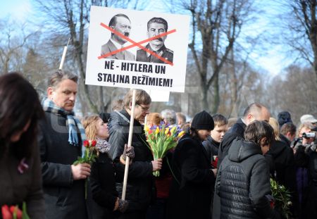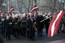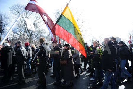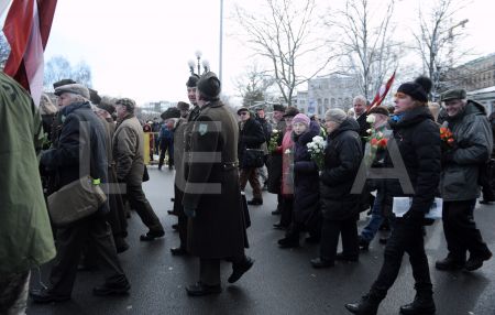 Cilvēki vēro latviešu leģionāru piemiņas gājienu, kas ieradies nolikt ...